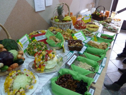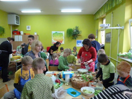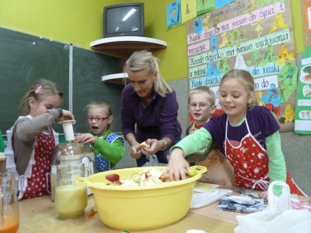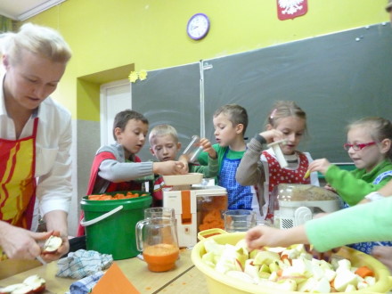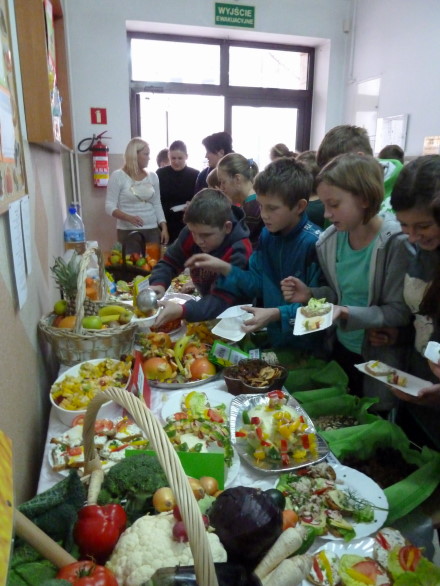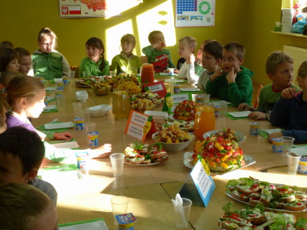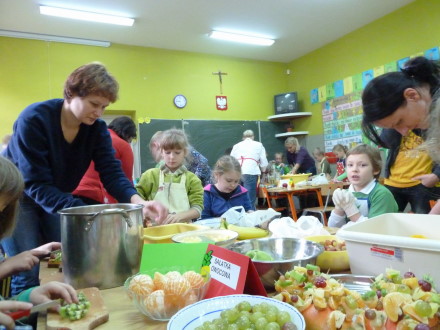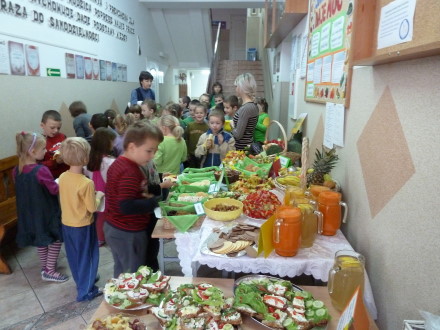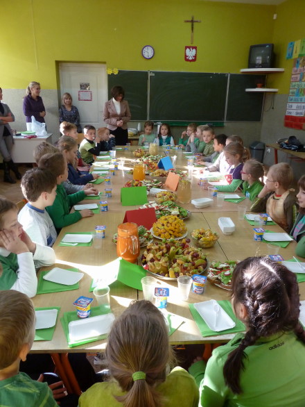 W ramach programu edukacyjnego „Śniadanie daje moc!” w dniu 8 listopada dzięki zaangażowaniu i wsparciu rodziców dzieci, klasa II zorganizowała w Szkole Podstawowej w Koźmicach Wielkich pyszne i zdrowe śniadanie. Postawiliśmy na zdrowe, pełnowartościowe produkty. Wśród propozycji naszych uczniów znalazły się: pełnoziarniste kanapki z serem białym, rzodkiewką i szczypiorkiem, sałatka owocowa, koreczki owocowe i jarzynowo mięsne, a do tego świeżo wyciskane soki: marchwiowy, jabłkowy i pomarańczowy. Dzieci z zapałem przygotowywały potrawy. Nasze działania od samego rana budziły ogromne zainteresowanie wśród szkolnej społeczności. A ponieważ lubimy się dzielić - po skończonej pracy i degustacji śniadania w klasie, przenieśliśmy stoisko na szkolny korytarz. Stoły uginały się od smakołyków. Zapraszały kolorami i kusiły zapachem. Znalazły się na nich również zdrowe przekąski (doskonałe pomysły na zastąpienie słodyczy i chipsów): suszone i kandyzowane owoce, pestki słonecznika i dyni, orzechy laskowe, migdały, ciasteczka zbożowe i orkiszowe. Nakarmiliśmy 180 uczniów! Dzieci jedzą oczami – uwielbiają kolorowe i fantazyjne dania - ze smakiem pałaszowały więc przygotowane smakołyki. Każdy uczeń otrzymał również kubeczek świeżego soku owocowego lub napoju miodowo – cytrynowego oraz jabłko i marchewkę. Zobaczcie sami: