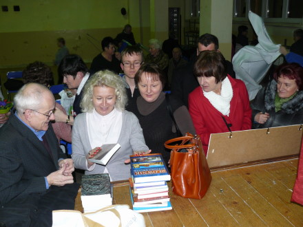 Jerzy Pilikowski: "W drugiej części wypowiedzi przedstawię książki, które napisałem. Mojej pierwszej książki pt. "Synowie Timokratesa" tu nie ma. "Opowieści Gęsiego Pióra" to gawęda o historii Polski, która w 1988 r. sprzedała się na pniu, a miała 70000 nakładu. Zarobiłem 100000, ale to wtedy były marne grosze, które od razu "zjadła" inflacja. Opowieści te "przećwiczyłem" na waszych dzieciach: jak reagują, co rozumieją. To jest książka w dużej mierze z mojej praktyki pedagogicznej.