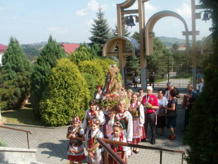 Po powitaniu gości panie z KGW staropolskim zwyczajem przekazały chleb i wieniec dożynkowy, wykonany przez Martę Czop starostom dożynek Barbarze i Stanisławowi Chlebda. Gospodarują Oni na ponad 2 ha. Uprawiają zboża, ziemniaki, warzywa. Mają ciągnik z oprzyrządowaniem i podstawowe maszyny rolnicze. Trawę aby jej nie zatruwać spalinami koszą kosiarką elektryczną. Mleko od 2 miesięcy doją dojarką elektryczną. Hodują 2 krowy, świnię, kury. Do smaku mleka sera, jajek, śmietany przekonało się wielu sąsiadów, którzy systematycznie zamawiają ekologiczną żywność. Po wręczeniu wieńca panie z KGW przyśpiewkami podziękowały rolnikom za całoroczny trud, starostom dożynek, organizatorom, sponsorom na czele z dyrektorem Małopolskiego Banku Spółdzielczego w Wieliczce Edwardem Biernackim. Autorką tekstów przyśpiewek była przewodnicząca KGW w Koźmicach Wielkich Elżbieta Woźniak.