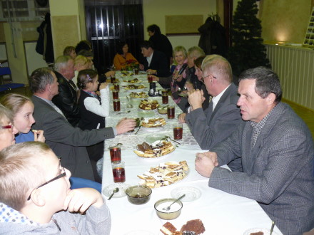 Jadwiga Duda zaprosiła wszystkich do wspólnego zdjęcia pod napisem „Koźmice - Koźmiczanie." Prelegentom wręczyła kalendarze na 2015 r. i „Przewodniki po Powiecie Wielickim" autorstwa Agnieszki Wolańskiej i Julian Rachwała. Zebrani wszyscy usiedli przy stole nakrytym białym obrusem. Panie z Koła Gospodyń Wiejskich położyły na nim ciasto i częstowany gości herbata i kawą.