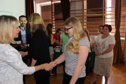 Dyrektor szkoły Pani Elżbieta Obal-Dyrek przywitała honorowych gości i zaprosiła do wspólnego z uczniami oglądania prac przygotowanych w ramach VII edycji projektu „W drodze do dorosłości" realizowanego z Narodowym Bankiem Polskim w ramach programu edukacji ekonomicznej.