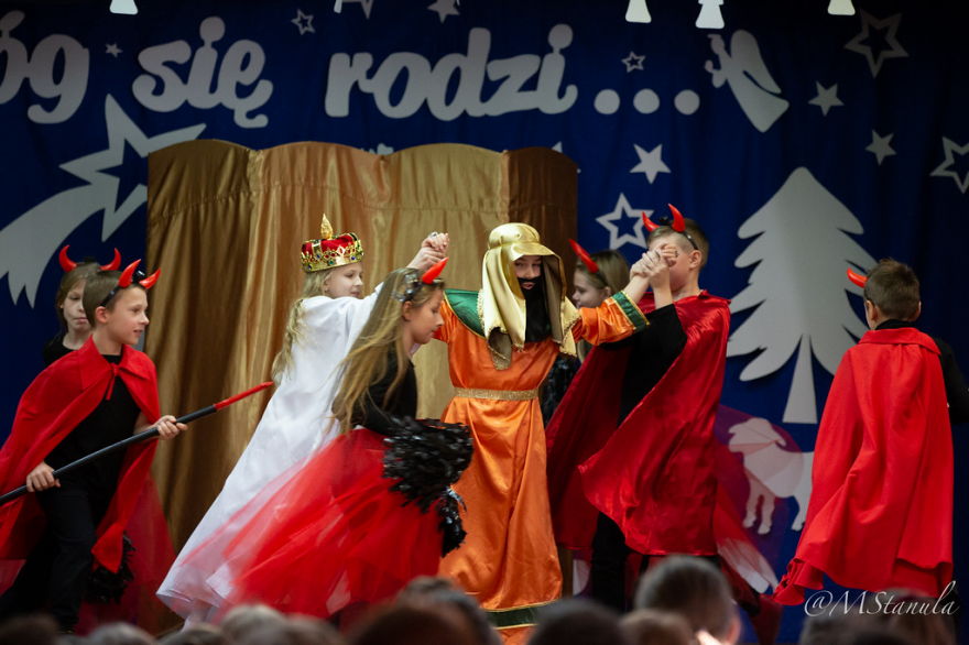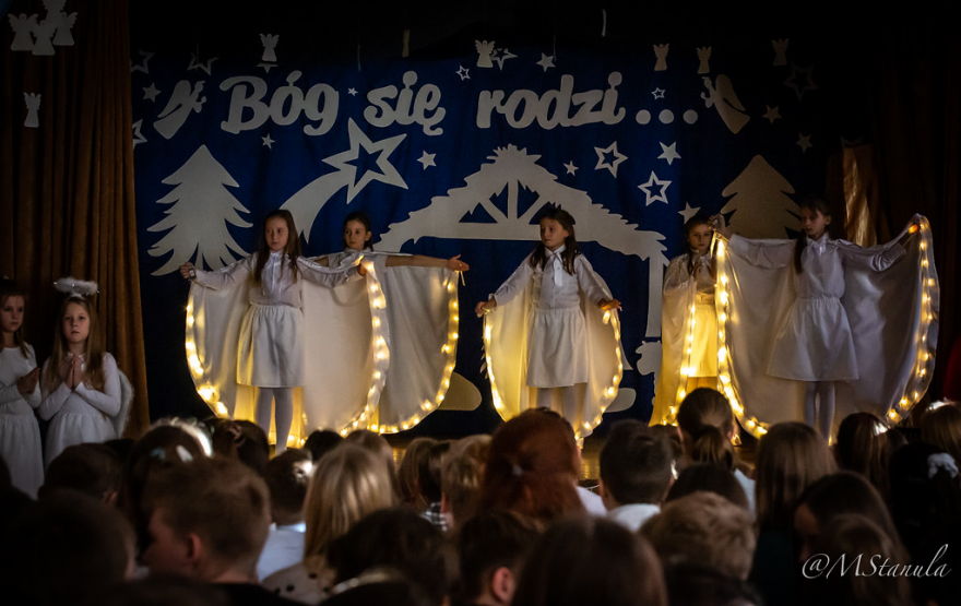 20 grudnia 2019r. był dniem szczególnym. Każda klasa z wychowawcą przygotowała spotkanie wigilijne. Na dolnym korytarzu wszyscy ubierali choinkę wieszając ozdoby w kolorach misyjnych - to inicjatywa Szkolnej Rady Uczniowskiej. Odbywał się kiermasz ozdób świątecznych - tu działali wolontariusze. Jednak najbardziej widowiskowym punktem dnia były Jasełka pt. Bóg się rodzi... Historia Bożego narodzenia opowiedziana została wg scenariusza przygotowanego przez panie: Kingę Hajduk, Adriannę Lembas i Dorotę Kabat. Aktorzy wcielili się w role aniołów, diabłów, pasterzy, królów, gwiazdeczki i oczywiście Maryi z Józefem. Nie zabrakło złego Heroda i jego damy dworu oraz śmierci, która cieszyła się na taniec z okrutnikiem. Przepiękna dekoracja, stroje, światła, muzyka, śpiew i taniec sprawiły, że zarówno uczniowie przedszkola i klas I - II, jak i starsi koledzy z klas IV - VIII przeżywali wydarzenia sprzed 2000 lat z wypiekami na twarzach.