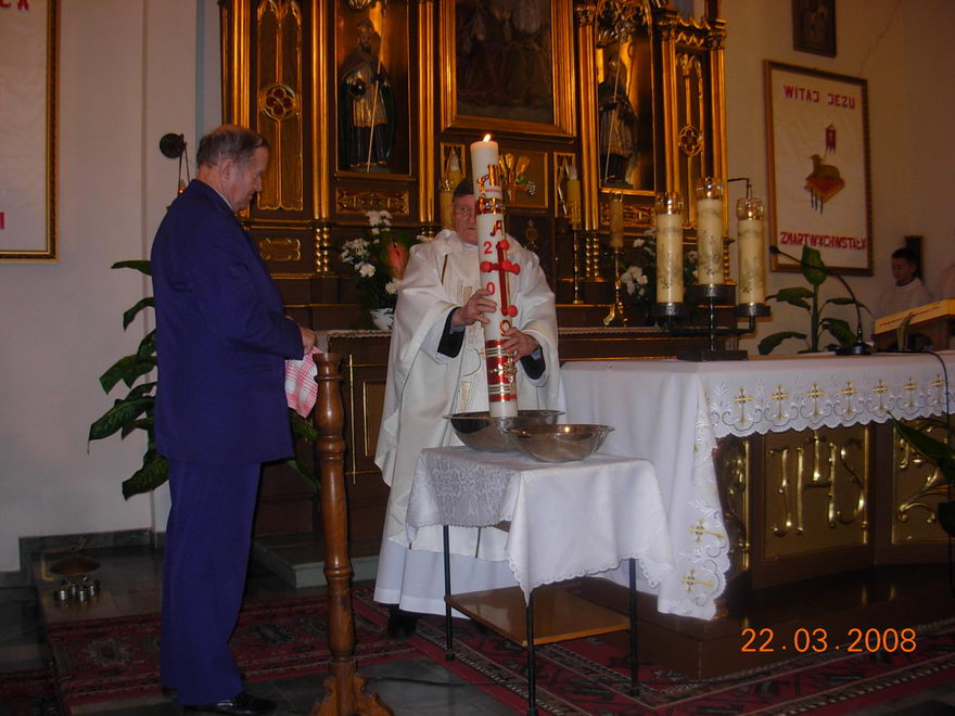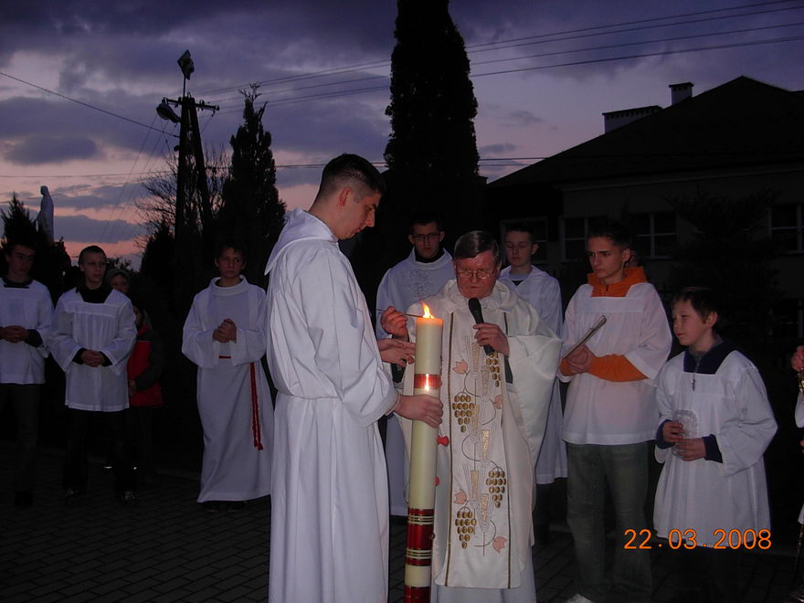 O godz. 1800 braliśmy udział w Wigilii Paschalnej, na którą złożyły się liturgie: światła, słowa, chrztu i Eucharystii. Uroczystość rozpoczęła się przed kościołem, poświęceniem ognia i paschału.Po procesyjnym wejściu do kościoła nastąpiło czytanie słowa Bożego.