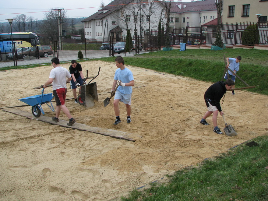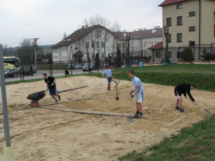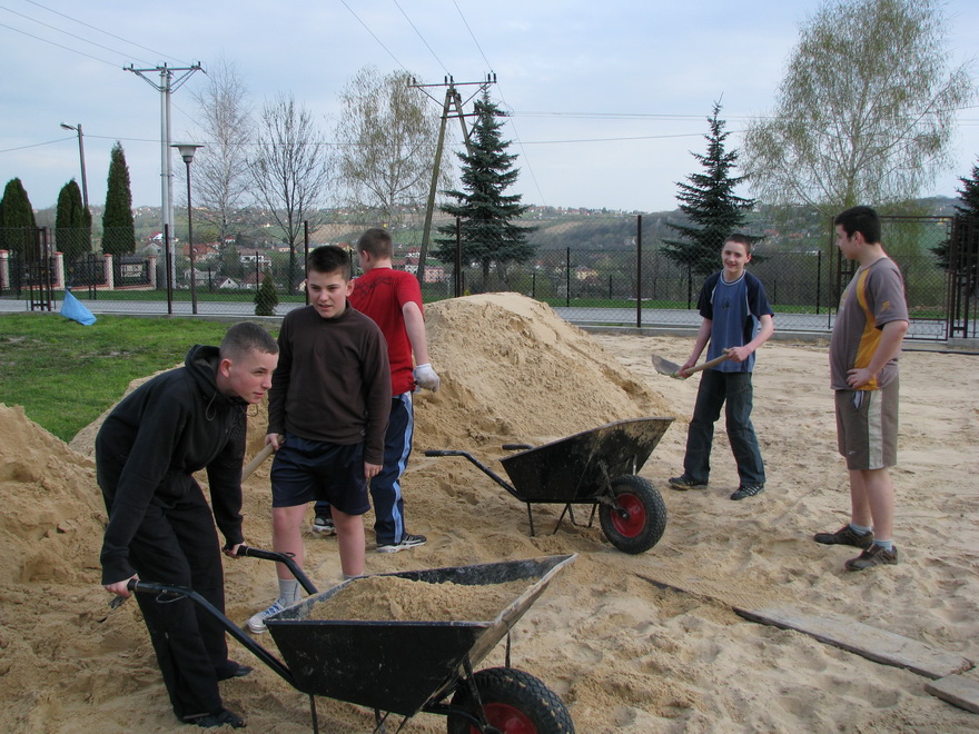 Uzupełniono braki piasku na boisku i skoczni. 50 ton piasku z Bukowna dostarczył skład budowlany pana Kowalczyka z Sierczy. Właściciel składu udzielił na ten towar 20% rabatu. Dostarczony materiał rozwozili własnoręcznie uczniowie Gimnazjum, pod bacznym nadzorem nauczycieli. Pozostała część została rozwieziona w ramach pracy społecznej pod okiem panów Kazimierza Windaka, Zbigniewa Kowala oraz katechety Tomasza Mistura. Dla młodzieży gimnazjalnej była to na pewno piękna lekcja wychowania prospołecznego. Miejmy nadzieję, że podjęte działania wynikały z potrzeby patriotyzmu lokalnego.