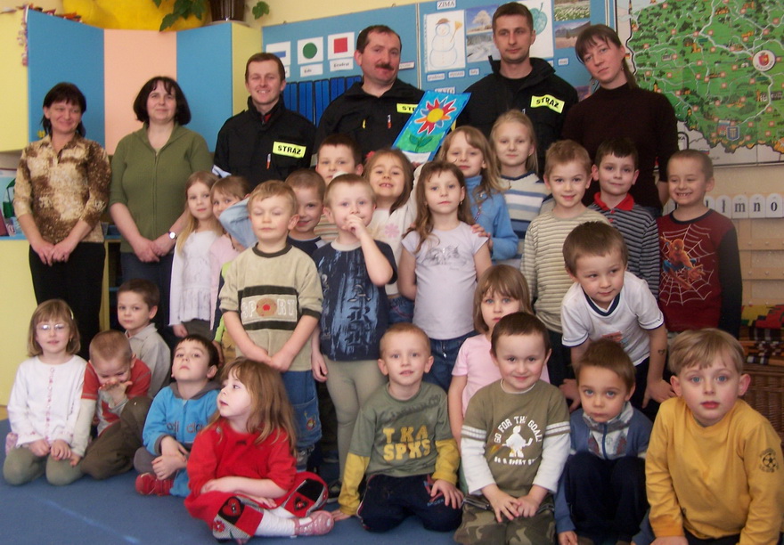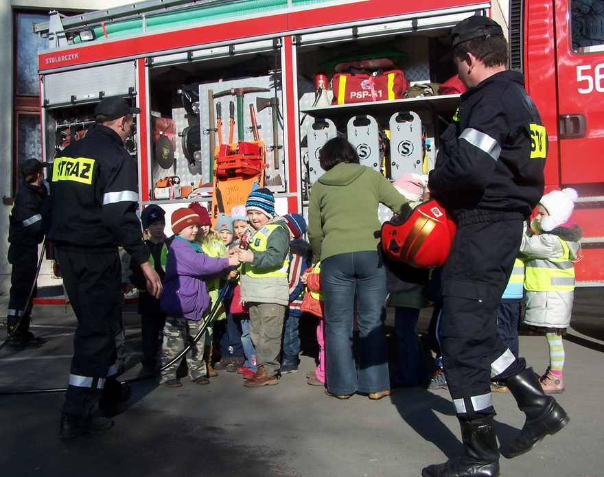 Dnia 7 marca pod przedszkole w Koźmicach Wielkich wielkim czerwonym wozem przybyli strażacy. Dla wszystkich, a zwłaszcza dla chłopców, z których większość marzy, aby zostać w przyszłości strażakiem, był to wielki dzień. Dzieci czynnie brały udział w spotkaniu z przedstawicielami straży pożarnej. Dowiedziały się, w jakich sytuacjach należy zachować szczególną ostrożność, czego dzieciom absolutnie nie wolno robić i jak się zachować w sytuacji niebezpieczeństwa. Poznaliśmy także ubiór strażaka oraz wyposażenie wozu strażackiego.
