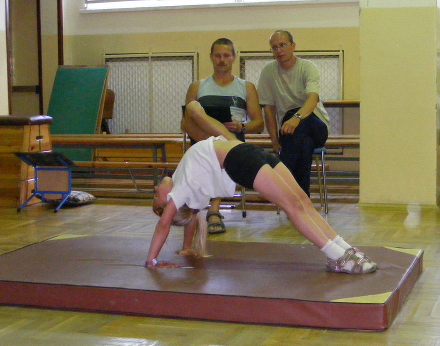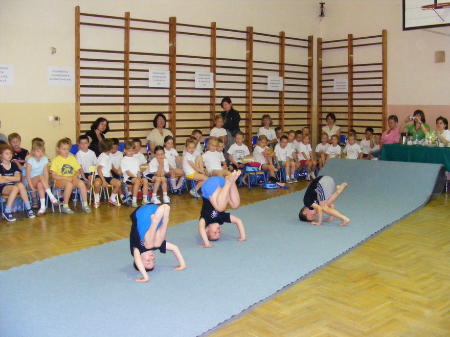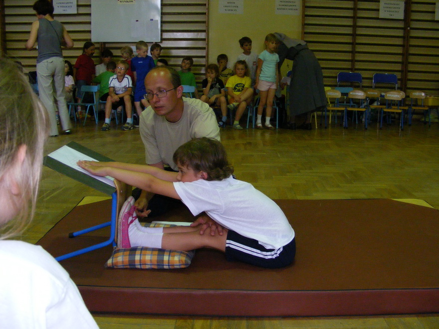 - gimnastyka (podpór łukiem leżąc tyłem, leżenie przerzutne i przewrotne, stanie równoważne i próba gibkościowa)