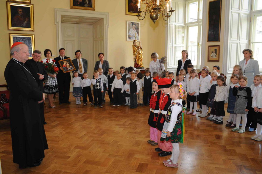 Ks. kardynał Stanisław Dziwisz był dla nas niezwykle serdeczny i ciągle nas zaskakiwał. Na początek poprosił przedstawicieli Bractwa Kurkowego, którzy wcześniej zakończyli wizytę u Kardynała o pozostanie i zaprezentowanie dzieciom Srebrnego Kura oraz swoich niezwykłych strojów. Panowie prośbę Kardynała spełnili. Później Jego Eminencja wypytywał dzieci o to, co najbardziej podobało im się w Krakowie, kto nauczył ich wierszyków i czy mają rodzeństwo.