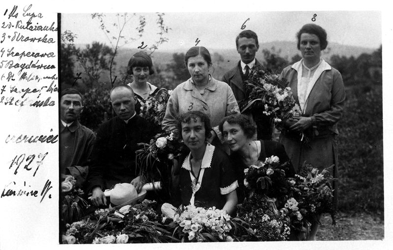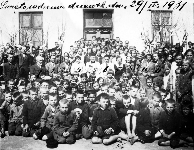 1. ks. Jan Lupa, 2. Maria Kułażanka, 3. Anna Pirowska, 4. Zofia Szaperowa, 5. Maria Bogdówna, 6. wizytator Franciszek Kulański, 7. kier. szk. Antoni Szaper (lata 1925-1932), 8. Maria Stefańska