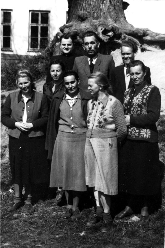 od lewej : Helena Duda, Jadwiga Dębska, Helena Stryszowska, kier. szk. Franciszek Poniewierski (lata 1932-1941) , ks. Bolesław Przybyszewski, Janina Lipowska, Wanda Juszkiewicz-Windak , z lewej strony w oknie Maria Kusina-żurek.
