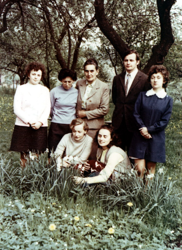 Grono nauczycielskie w 1974 roku w szkolnym ogrodzie zasadzonym w latach 30-tych XX wieku.