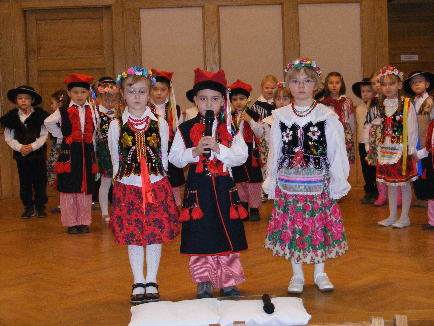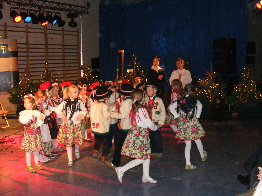 Dzieci, jak na artystów przystało, odważnie chwytając słuchaczy za serca grały swoje role. W chwili, kiedy trębacz zagrał Hejnał Mariacki publiczność była jakby zaczarowana - cisza, bezruch, wszystkie oczy skierowane na scenę, a na twarzach malował się zachwyt i ciekawość - co się teraz wydarzy? I stało się - na scenę wkroczyli krakowiacy i górale. Ci pierwsi tańcem krakowskim Bogu chwałę dali, a „Bratkowie Dzieciątku tańcowali - dobry taniec, zbójnickiego".