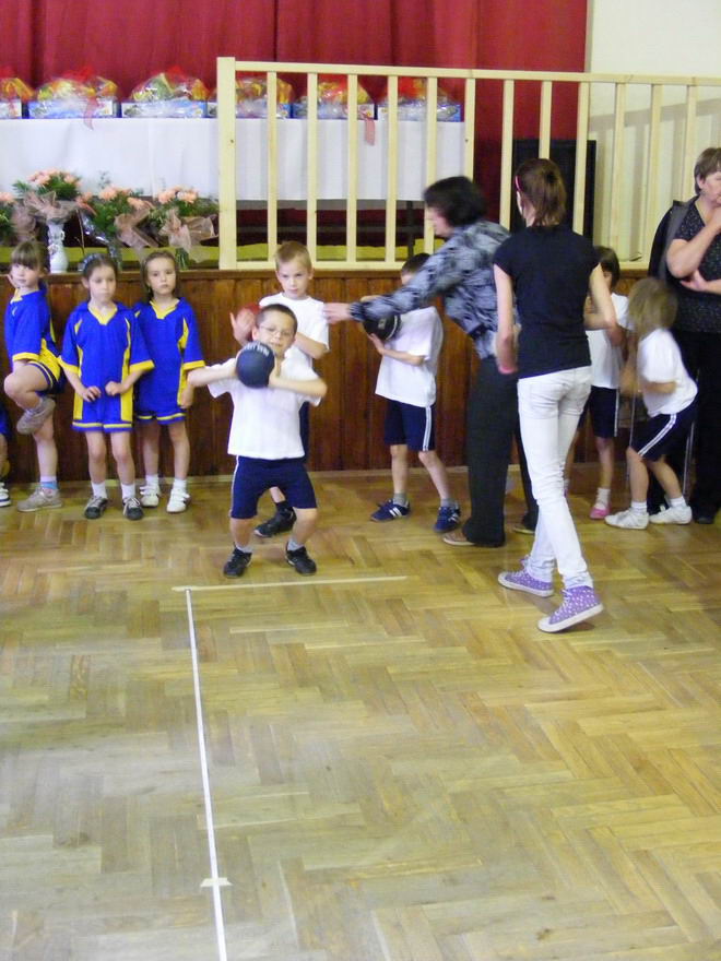 kopercie, rzut piłką lekarską oraz elementy gimnastyczne - wagę, leżenie