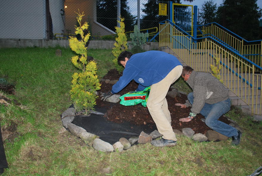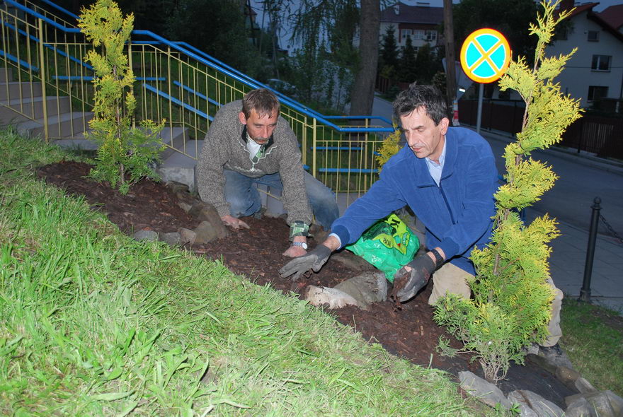 Janowski, posadzili 20 szt. krzewów ozdobnych, przed Domem Kultury, na zboczu