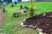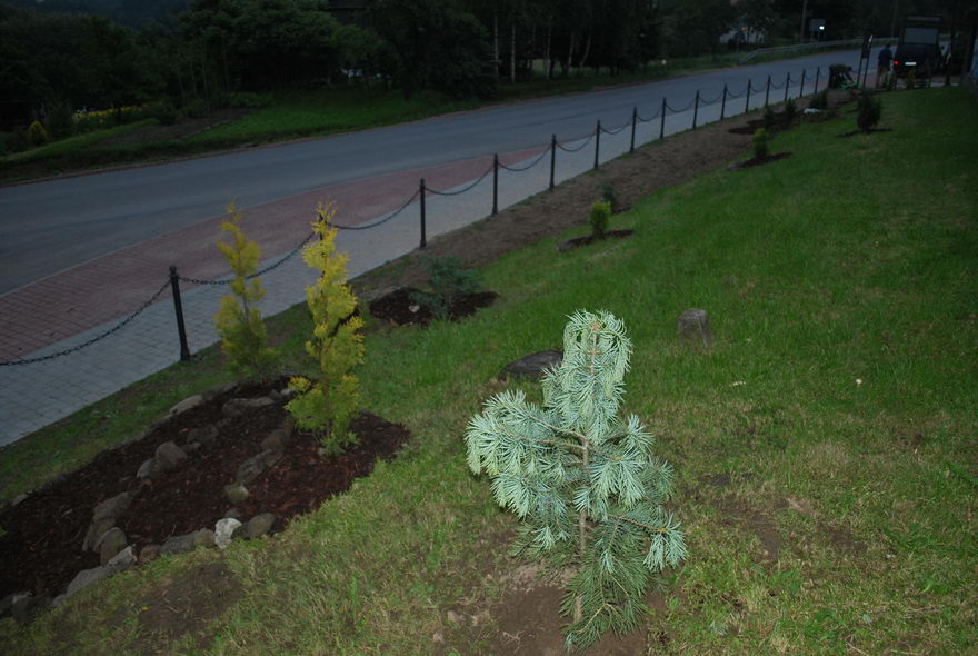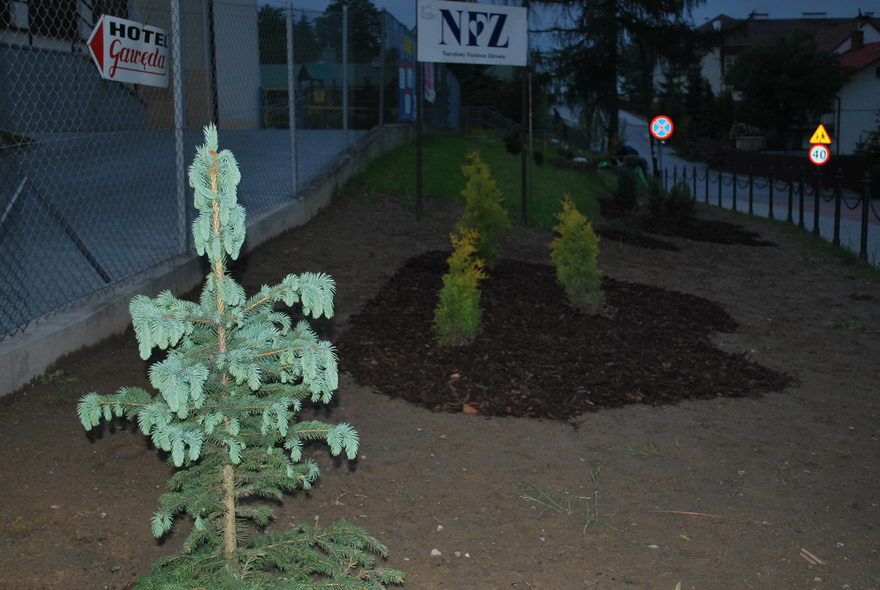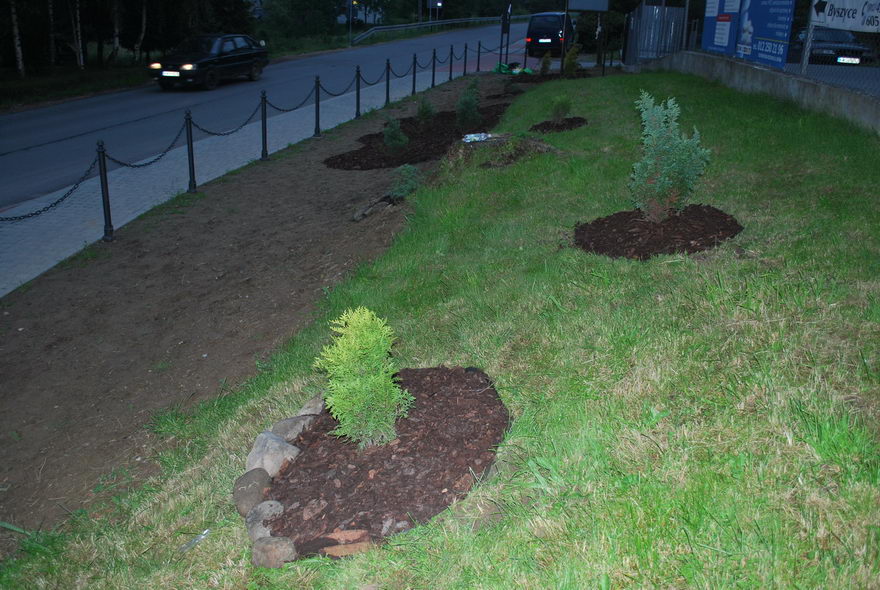 od strony ulicy. Wokół krzewów została rozłożona folia ogrodnicza, wysypano