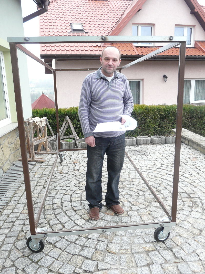 p. Robert Kwinta przyspawał do konstrukcji 4 koła, w tym 2 obrotowe i metalowy