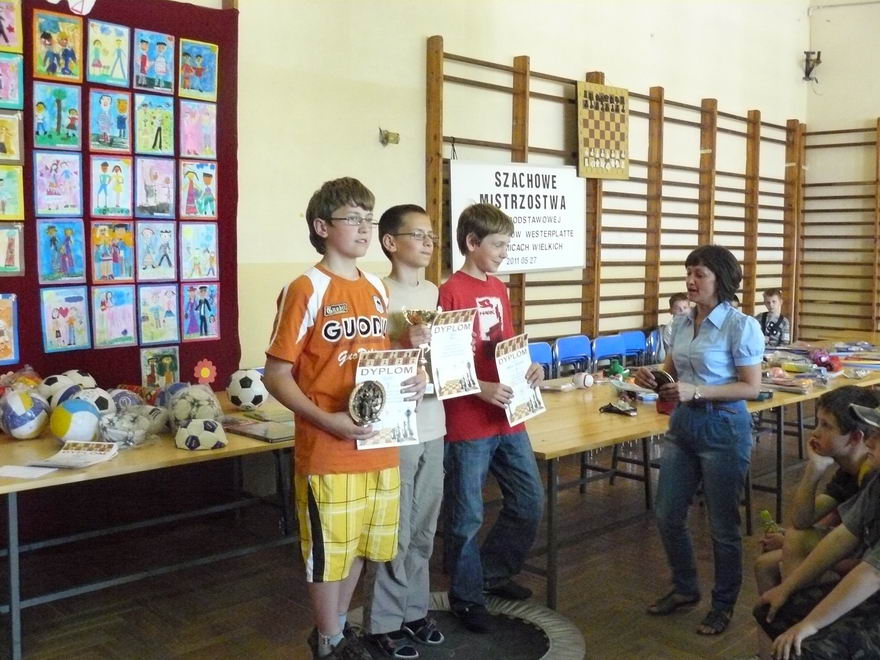 Szachowym mistrzem szkoły został Grzegorz Wolanin z klasy V wygrywając wszystkie partie. Drugi był Sebastian Czop z 4 punktami. Po 4 punkty zdobyli również Marcin Wieczorek, Dominik Malec i Kacper Szałański. O ich miejscach zadecydowała punktacja pomocnicza zgodna z kodeksem szachowym. Po 3,5 pkt. zdobyli Kamil Jochacz i Jacek Miękina. Pierwszą dziesiątkę zamknęli: Mikołaj Wolanin, Wojciech Trędowicz, Michał Anioł, każdy z 3 punktami. Wszyscy uczestnicy mistrzostw otrzymali dyplomy i nagrody ufundowane przez rodzinę Wolaninów i sędziego. Puchary i statuetki najlepszym wręczyła dyrektor szkoły Danuta Kaperek. Sędziemu pomagała w prowadzeniu zawodów nauczycielka wychowania fizycznego Grażyna Gwiżdż.