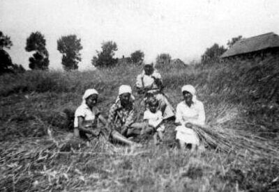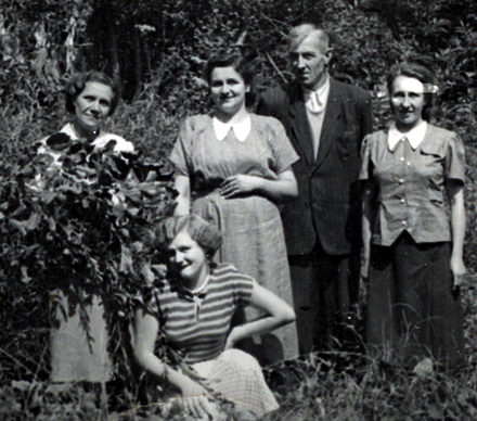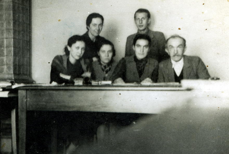 Fot. Pracownicy urzędu gminy w 1945 roku : stoją Zofia Sumera, Zbigniew NN, siedzą:Zofia Gabryś, Janina Cygan, Helena Pirowska,Józef Michalik
