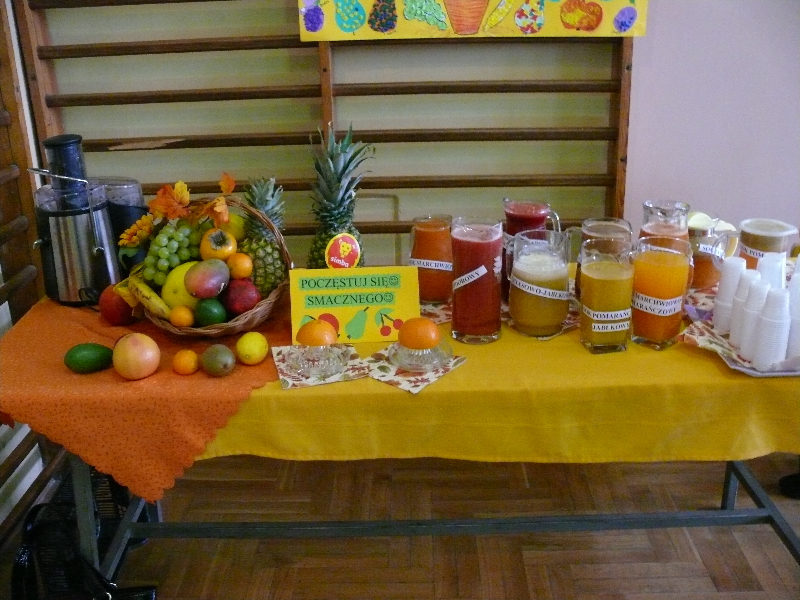 Po części artystycznej nastąpiła degustacja soków ze świeżych owoców i warzyw, sałatek owocowo-warzywnych oraz zdrowych przekąsek, przygotowanych przez rodziców, które znikały ze „straganów" w mgnieniu oka.