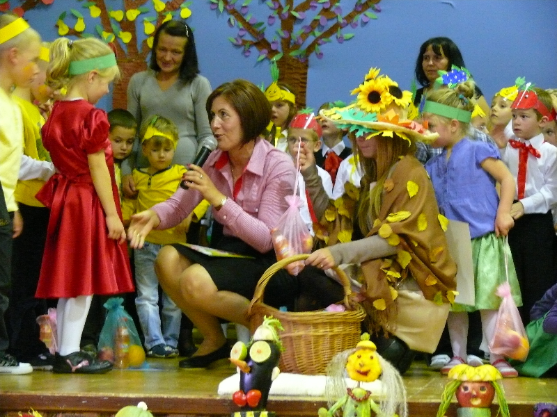 Ważnym punktem uroczystości było pasowanie na przedszkolaka dzieci, które swą przygodę z naszym przedszkolem zaczynają w tym roku po raz pierwszy. Pani dyrektor Ewa Kaczor pełniła rolę Mistrza Ceremonii, a pani Małgorzata Tracz, w stroju Pani Jesieni, wręczała świeżo upieczonym przedszkolakom paczuszki z owocami i sokiem z marchewki. Jak się później okazało, żadne dziecko nie wyszło z przedszkola bez buteleczki soku.