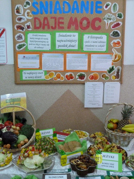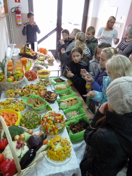 W ramach programu edukacyjnego „Śniadanie daje moc!” w dniu 8 listopada dzięki zaangażowaniu i wsparciu rodziców dzieci, klasa II zorganizowała w Szkole Podstawowej w Koźmicach Wielkich pyszne i zdrowe śniadanie. Postawiliśmy na zdrowe, pełnowartościowe produkty. Wśród propozycji naszych uczniów znalazły się: pełnoziarniste kanapki z serem białym, rzodkiewką i szczypiorkiem, sałatka owocowa, koreczki owocowe i jarzynowo mięsne, a do tego świeżo wyciskane soki: marchwiowy, jabłkowy i pomarańczowy. Dzieci z zapałem przygotowywały potrawy. Nasze działania od samego rana budziły ogromne zainteresowanie wśród szkolnej społeczności. A ponieważ lubimy się dzielić - po skończonej pracy i degustacji śniadania w klasie, przenieśliśmy stoisko na szkolny korytarz. Stoły uginały się od smakołyków. Zapraszały kolorami i kusiły zapachem. Znalazły się na nich również zdrowe przekąski (doskonałe pomysły na zastąpienie słodyczy i chipsów): suszone i kandyzowane owoce, pestki słonecznika i dyni, orzechy laskowe, migdały, ciasteczka zbożowe i orkiszowe. Nakarmiliśmy 180 uczniów! Dzieci jedzą oczami – uwielbiają kolorowe i fantazyjne dania - ze smakiem pałaszowały więc przygotowane smakołyki. Każdy uczeń otrzymał również kubeczek świeżego soku owocowego lub napoju miodowo – cytrynowego oraz jabłko i marchewkę. Zobaczcie sami: