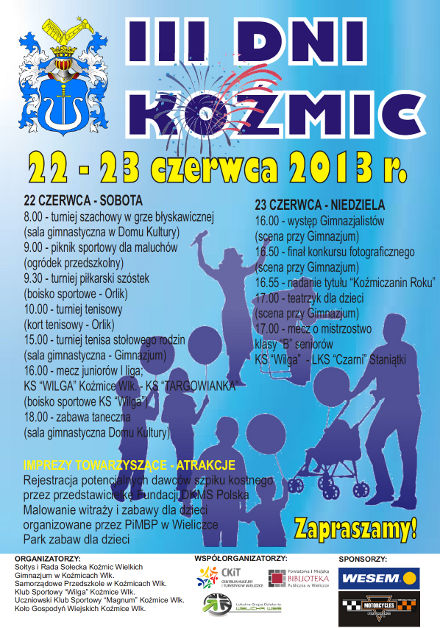 Fotorelacja z III Dni Koźmic Podsumowanie imprezy Przemówienie Sołtysa Koźmic Wielkich Wyniki Rodzinnego Turnieju Tenisa Stołowego Wyniki Turnieju Szachowego Wyniki Turnieju Rzutów Lotką Lista Sponsorów Trzecich Dni Koźmic
