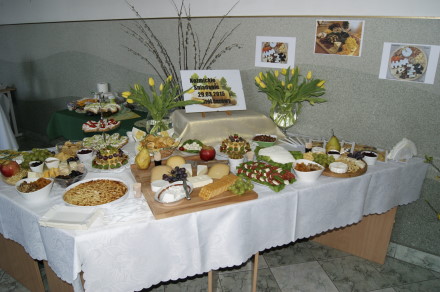 Stół Burmistrza, stoły ciastowy, serowy, wielkanocny, z przetworami, chlebowy, nauczycielski, pyszne lody i świeże soki z owoców i warzyw zachęcały do degustacji potraw, sałatek, wypieków, pierogów, zup, przetworów stworzonych wg. domowych, rodzinnych przepisów. Spotkali się w jednym miejscu przedstawiciele władz Miasta i Gminy Wieliczka - p. Urszula Rusecka Pełnomocnik Burmistrza ds. Edukacji, p. Bogusław Kośmider przewodniczący Rady Miasta Krakowa, p. Tomasz Machnik kierownik Wydziału Edukacji, Radni Miasta i Gminy Wieliczka, mieszkańcy okolicznych miejscowości, uczniowie szkół, ich rodzice, znajomi i przyjaciele gimnazjum. Przybywały całe rodziny. Kilkadziesiąt osób skorzystało z porad dietetyka, sprawdziło się w teście nt. mitów i faktów związanych ze zdrowym odżywianiem. Wielu spodobało się możliwość wypróbowania urządzeń do ćwiczeń w domu lub chociażby zabawy z hula-hop. Miejsca gdzie można było przysiąść zjeść i porozmawiać lub posłuchać muzyki były cały czas zajęte. Przez trzy godziny goście spacerowali, degustowali, rozmawiali i uśmiechali się do siebie.