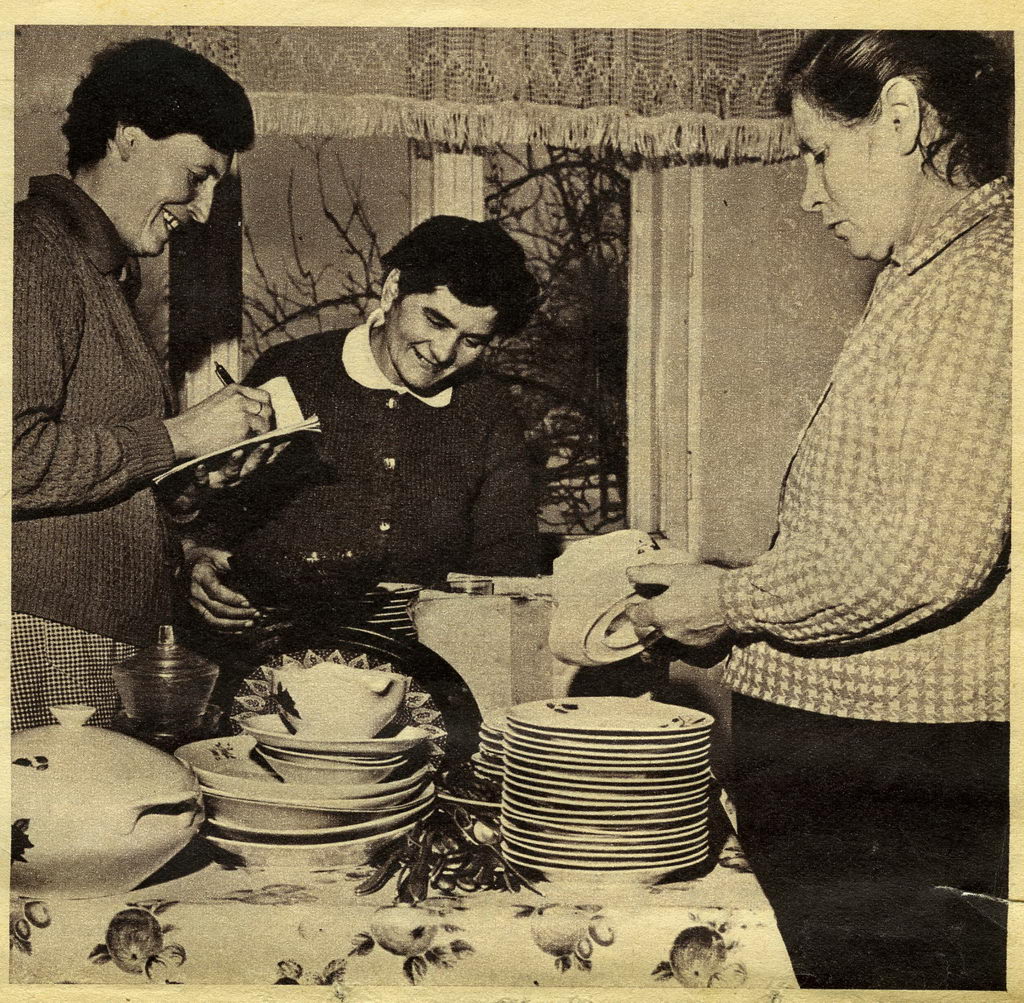 Koło Gospodyń w Koźmicach Wielkich, pow. Kraków, zrzesza 56 kobiet. Jedną z najbardziej popularnych form pracy tego kola jest organizowanie i udział w licznych konkursach, które uwieńczone są zwykle nagrodami, wyróżnieniami i dyplomami. Na zdjęciu przewodnicząca koła Zofia Kusina, skarbnik - Antonina Piątek i sekretarz- Józefa Latosińska dokonują przeglądu naczyń w prowadzonej przez KGW wypożyczalni sprzętu gospodarstwa domowego.