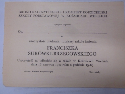 Wujek Klemens wydrukował zaproszenia na uroczystość nadania imienia szkole w Koźmicach. Wszystko było dopięte na ostatni guzik. Ale niestety w ostatniej chwili przyszło zawiadomienie, że Kuratorium Oświaty w Krakowie potraktowało sprawę odmownie. Myślę, że na wniosek PZPR-u, bo tato reżimu komunistycznego nie cierpiał a reżim, jego z wzajemnością.. Niestety mimo szczerych chęci i zabiegów w wielu sprawach - szkoła w Koźmicach została nazwana Obrońców Westerplatte.