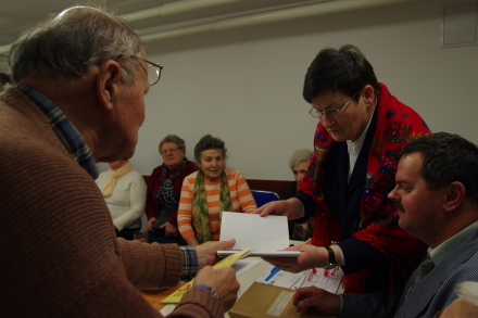 Zebrani wspólnie śpiewali: „Życzymy, życzymy i zdrowia i szczęścia przez ręce Maryi" i „Barkę". Pan sołtys wszystkich poczęstował czekoladkami. W spotkaniu uczestniczyło 18 osób. Elżbieta Woźniak, przewodnicząca Koła Gospodyń Wiejskich podała ciasto na stół i zrobiła herbatę za co jesteśmy wdzięczni, także i paniom, które ciasto upiekły i przyniosły. Panu Sołtysowi dziękuję za rozwieszenie afiszy na tablicach informacyjnych we wsi, a Dorocie Cora za fotografowanie przebiegu spotkania. Brakowało na spotkaniu nauczycieli, uczniów Szkoły Podstawowej w Koźmicach Wielkich - o co prosiłam kierując pismo do Pani Dyrektor od Stowarzyszenia „Klub Przyjaciół Wieliczki".