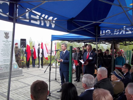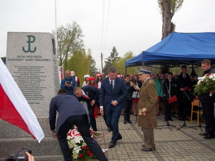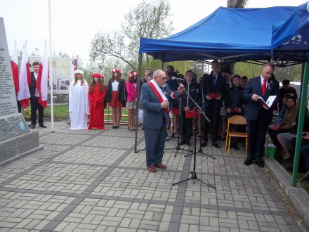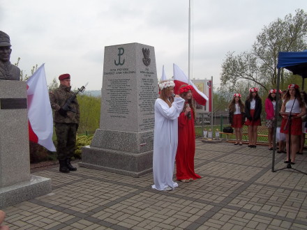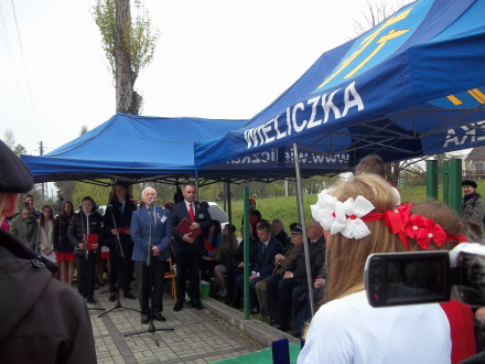 Do zebranych przemówił Artur Kozioł. Józef Gawron wręczył Urszuli Ruseckiej odznaką „Pro Patria" i zabrał głos. Następnie wystąpił Piotr Kurek, który wspomniał historię powstania pomnika oraz żołnierzy, którym go poświęcono. Zwrócił uwagę, że jednym z nich był Stanisław Guzikowski, który 75 lat temu został zamordowany w KL Auschwitz. Odznaczył Magdalenę Golonkę, kierownik Wydziału Kultury UMiG Wieliczka i Adama Panusia Odznaczeniami Pamiątkowymi Za Zasługi Dla ŚZŻAK. (22kwietnia br. w Wieliczce w sali „Magistrat" podczas spotkania wielkanocnego i walnego zebrania Klubu Przyjaciół Wieliczki to odznaczenie P. Kurek wręczył Jadwidze Dudzie.) Ojciec Jerzy Pająk poprowadził modlitwę w intencji żołnierzy ZWZ - AK Placówki „Sosna-Las". Głos zabrał emerytowany nauczyciel, Edward Jankowski z Zarządu SZŻAK w Krakowie. Tomasz Guzik, katecheta w gimnazjum wspomniał, że chór szkolny we współpracy z Fundacją „Wygrajmy Siebie" nagrał płytę pt. „Warto być patriotą". Płyty zostały rozdane gościom spotkania. Z programem artystycznym wystąpili uczniowie Gimnazjum w Koźmicach Wielkich. Katarzyna i Zuzanna Czop ubrane na biało i czerwono zaprezentowały wiersz o polskiej fladze. W występie słowno - muzycznym młodzież pieśnią, wierszem, tańcem podkreślała wartość flagi, która obok godła jest symbolem wolnego i niepodległego państwa, łączy wszystkich Polaków. Publiczność występ nagrodziła gromkimi brawami. Przed pomnikiem wiązanki kwiatów złożyli: wicewojewoda, burmistrz, starosta, delegacja Stowarzyszenia „Klub Przyjaciół Wieliczki", Klubu Historycznego, mieszkańcy. Zapalono znicze.