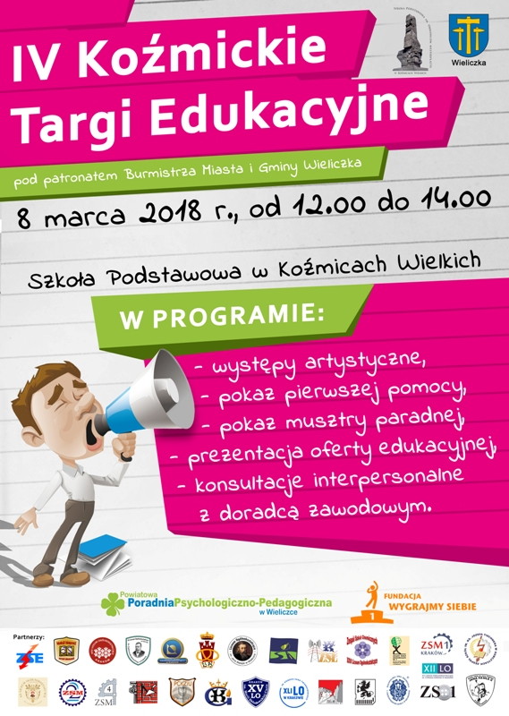 W czwartek 8 marca 2018 r. w Szkole Podstawowej im. Obrońców Westerplatte w Koźmicach Wielkich odbyły się IV Koźmickie Targi Edukacyjne. Patronat honorowy nad imprezą objął Burmistrz Miasta i Gminy Wieliczka Artur Kozioł, który dokonał otwarcia targów i zaprosił wszystkich uczestników do zapoznania się z ofertą edukacyjną szkół, z którymi wiążą swoją niedaleką przyszłość tegoroczni absolwenci wielickich szkół. Gości powitała również pani dyrektor Szkoły Podstawowej