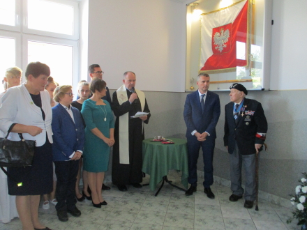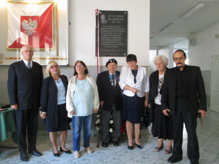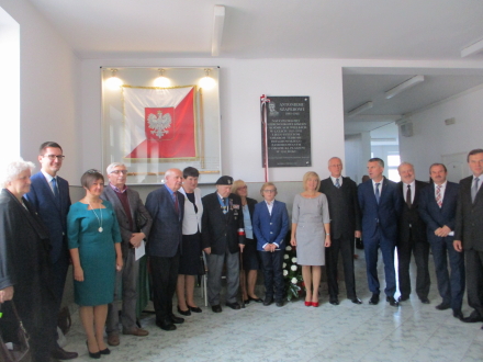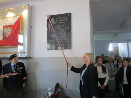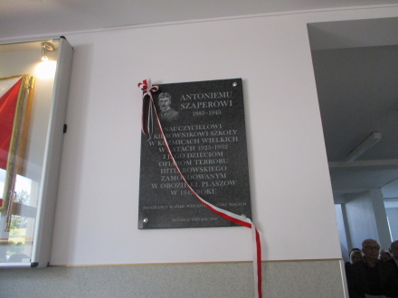 Koźmice Wielkie - odsłonięcie w Szkole Podstawowej tablicy ku pamięci Antoniego Szapera (1883-1943), nauczyciela i kierownika tej szkoły w latach 1925-1932 zamordowanego w KL Plaszow w 1943 r.