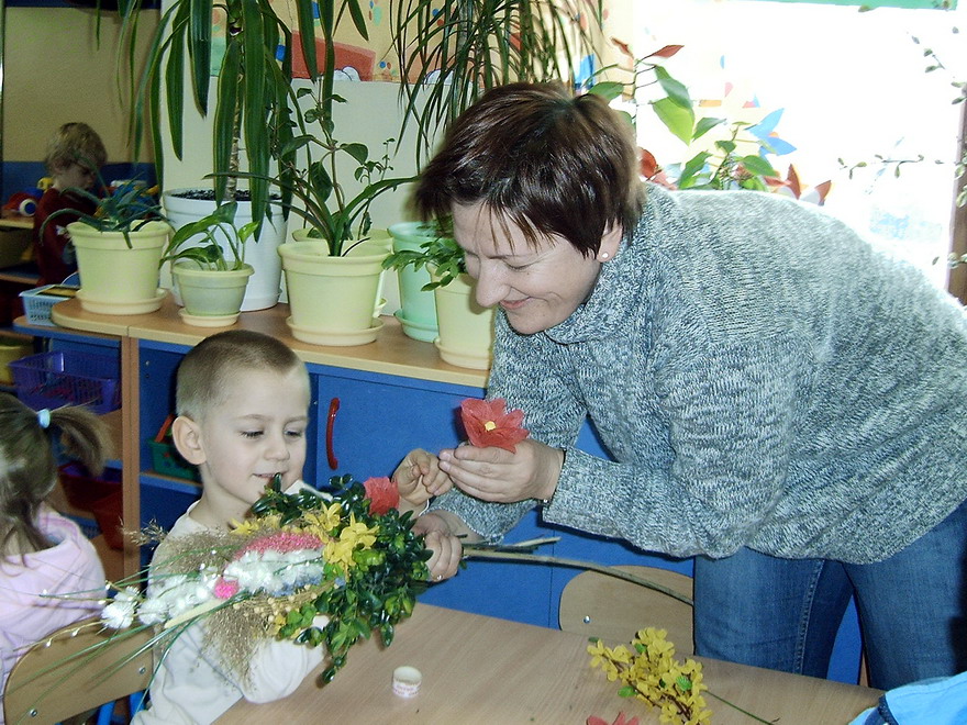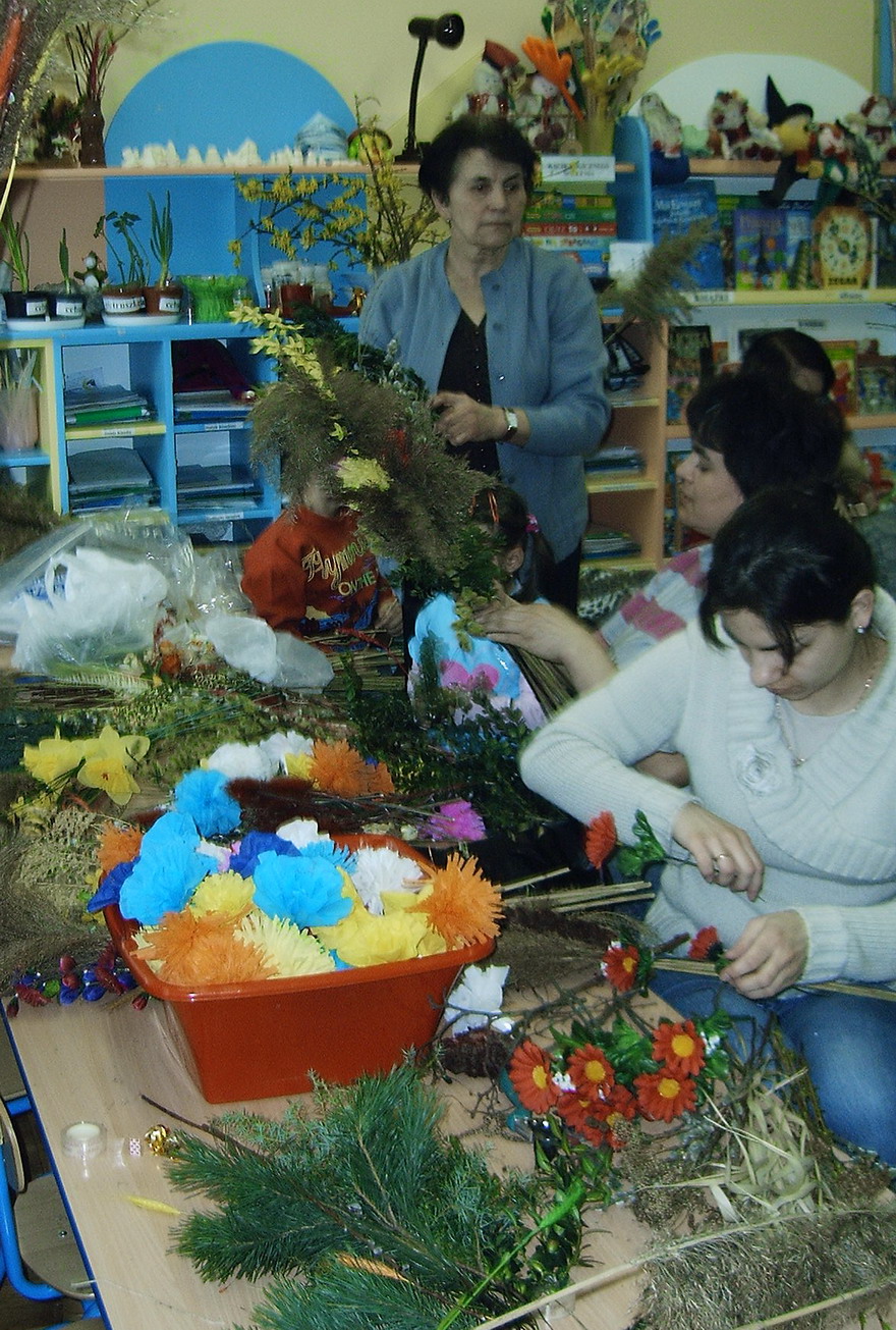 W radosnej atmosferze Maluszki i Starszaki przystąpiły do pracy. Wierzbowe gałązki z „kotkami", bukszpan i suszone trawy przyozdabiały suszonymi kwiatami i zrobionymi z bibuły, malowanymi kłosami zbóż i wstążkami.