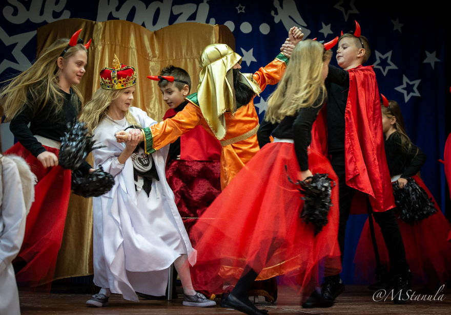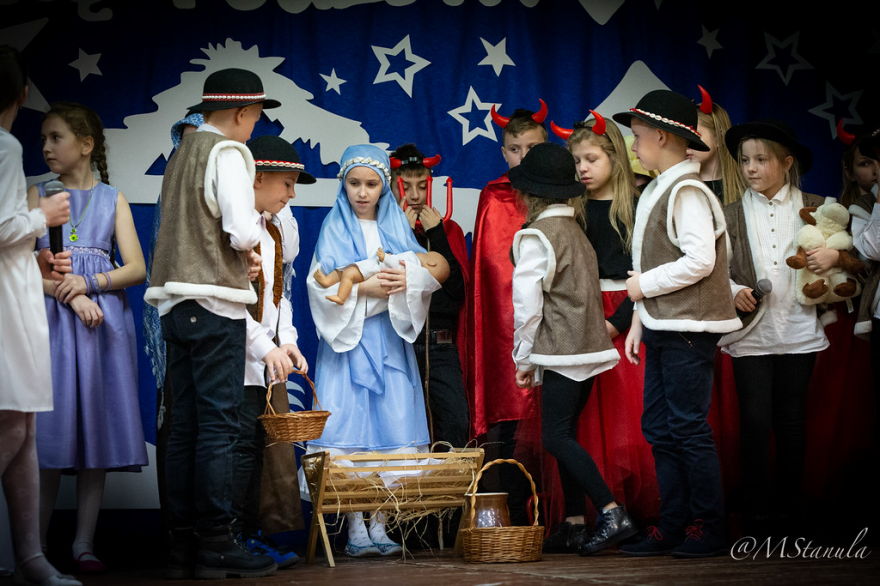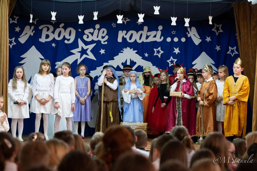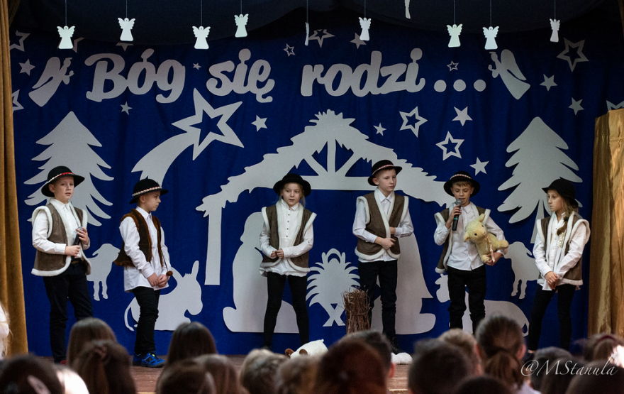 20 grudnia 2019r. był dniem szczególnym. Każda klasa z wychowawcą przygotowała spotkanie wigilijne. Na dolnym korytarzu wszyscy ubierali choinkę wieszając ozdoby w kolorach misyjnych - to inicjatywa Szkolnej Rady Uczniowskiej. Odbywał się kiermasz ozdób świątecznych - tu działali wolontariusze. Jednak najbardziej widowiskowym punktem dnia były Jasełka pt. Bóg się rodzi... Historia Bożego narodzenia opowiedziana została wg scenariusza przygotowanego przez panie: Kingę Hajduk, Adriannę Lembas i Dorotę Kabat. Aktorzy wcielili się w role aniołów, diabłów, pasterzy, królów, gwiazdeczki i oczywiście Maryi z Józefem. Nie zabrakło złego Heroda i jego damy dworu oraz śmierci, która cieszyła się na taniec z okrutnikiem. Przepiękna dekoracja, stroje, światła, muzyka, śpiew i taniec sprawiły, że zarówno uczniowie przedszkola i klas I - II, jak i starsi koledzy z klas IV - VIII przeżywali wydarzenia sprzed 2000 lat z wypiekami na twarzach.