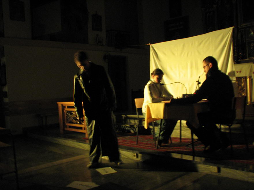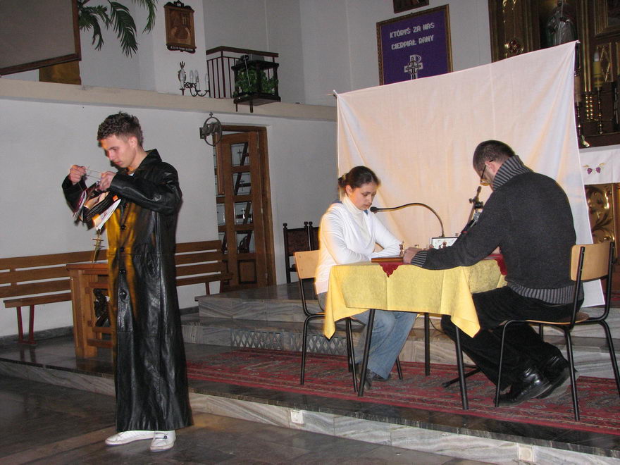 W piątek 14.03. 2008 roku o godzinie 1900 w Kościele w Koźmicach Wielkich zapanowała zupełna ciemność i cisza. Ową ciszę przerwała muzyka z filmu „Pasja", a w czerwonym świetle, na tle białego płótna pojawiły się dwie postacie - jedna ubrana na czarno, a druga na biało. Po przywitaniu zasiadły do partii szachów. Przesuwając pionki na szachownicy, wymieniały swoje poglądy i myśli na temat życia. Po każdej wymianie zdań ukazywał się człowiek symbol - w czarnym płaszczu, który dopełniał rozmowę - znakami. Następujące po sobie: rozmowę i występ postaci symbolu, przedzielała grana na flecie i skrzypcach pieśń „Któryś za nas...". Po zakończonej „grze" białe płótno opadło i ukazał się krzyż, który wszyscy mogli adorować. Na zakończenie usłyszeliśmy pieśń „Golgota". Całość przedstawienia przygotowała młodzież z Koła Wolontariatu działającego przy Gimnazjum w Koźmicach Wielkich. Na uwagę zasługuje fakt, iż część uczniów występujących w przedstawieniu była z poza parafii Koźmickiej, co świadczy, że Kościół jest jeden i ponad podziałami. Młodzież już czeka na kolejne sceniczne drogi krzyżowe, zarówno aby je przygotować oraz by się podczas nich modlić.