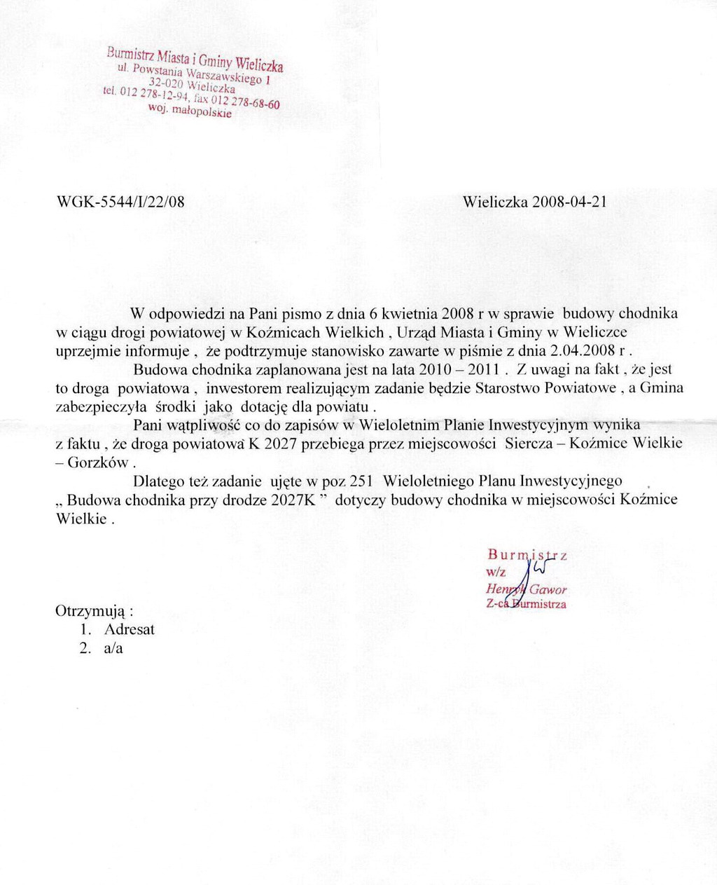 Otrzymaliśmy kopię odpowiedzi przesłanej przez Burmistrza Gminy do organizatorów apelu o budowę chodnika. Z odpowiedzi wynika, że chodnik przy drodze powiatowej w Koźmicach Wielkich będzie wykonany w latach 2010-2011. Zadanie inwestycyjne nr 251 opisane zostało mylnie w Wieloletnim Planie Inwestycyjnym jako „budowa chodnika w Gorzkowie", podczas gdy chodnik w miejscowości Gorzków przy drodze 2027 powstanie w tym roku w ramach zadania 249. Wynika stąd, że chodnik w ramach zadania 251 powstanie od skrzyżowania z drogą „na Bugaj" (przystanek Busów) do cmentarza w Gorzkowie. Pozostaje nam mobilizacja sołtysów i radnych z Koźmic do pilnowania, aby przypadkiem zadanie 251 nie zostało pominięte lub przesunięte podczas przygotowywania budżetu na rok 2010. Aby nie okazało się, że są w Gminie pilniejsze potrzeby niż inwestycje w Koźmicach, albo że zadanie nr 251 zostanie przedefiniowane w sposób niekorzystny dla Koźmic.