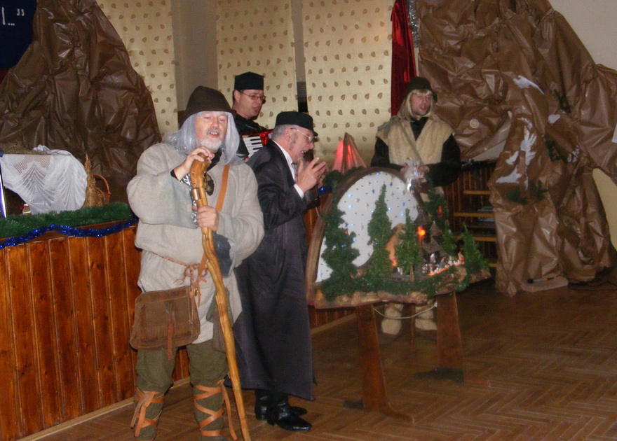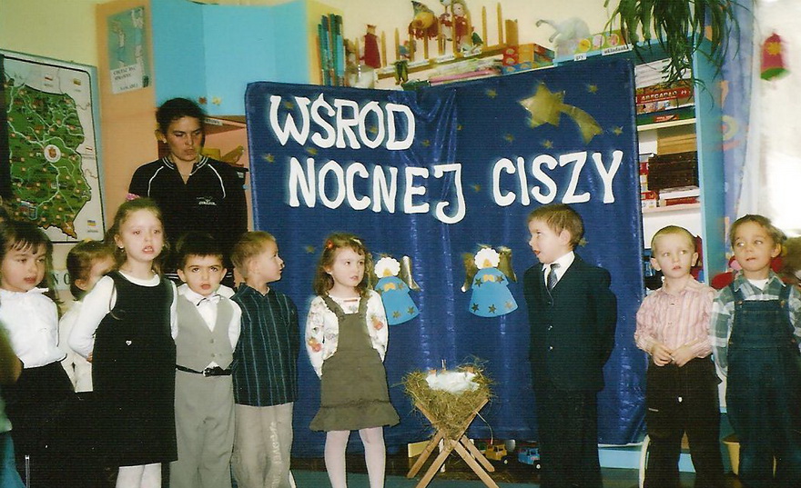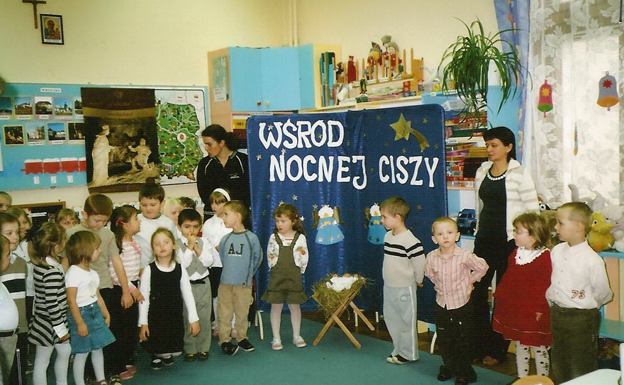 Dnia 20 grudnia mieliśmy w przedszkolu wspólną wigilię, która poprzedzona była naszym krótkim wystąpieniem. Następnie dzieliliśmy się opłatkiem, składaliśmy sobie życzenia, śpiewaliśmy kolędy. A na końcu przybyli do Nas kolędnicy w strojach ludowych z piękną szopką tradycyjnie kolędując.