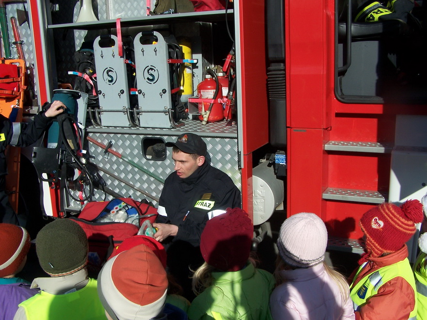 Dnia 7 marca pod przedszkole w Koźmicach Wielkich wielkim czerwonym wozem przybyli strażacy. Dla wszystkich, a zwłaszcza dla chłopców, z których większość marzy, aby zostać w przyszłości strażakiem, był to wielki dzień. Dzieci czynnie brały udział w spotkaniu z przedstawicielami straży pożarnej. Dowiedziały się, w jakich sytuacjach należy zachować szczególną ostrożność, czego dzieciom absolutnie nie wolno robić i jak się zachować w sytuacji niebezpieczeństwa. Poznaliśmy także ubiór strażaka oraz wyposażenie wozu strażackiego.