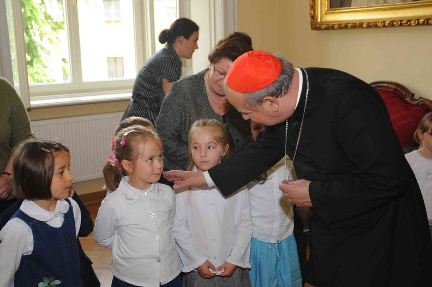 Ks. kardynał Stanisław Dziwisz był dla nas niezwykle serdeczny i ciągle nas zaskakiwał. Na początek poprosił przedstawicieli Bractwa Kurkowego, którzy wcześniej zakończyli wizytę u Kardynała o pozostanie i zaprezentowanie dzieciom Srebrnego Kura oraz swoich niezwykłych strojów. Panowie prośbę Kardynała spełnili. Później Jego Eminencja wypytywał dzieci o to, co najbardziej podobało im się w Krakowie, kto nauczył ich wierszyków i czy mają rodzeństwo.
