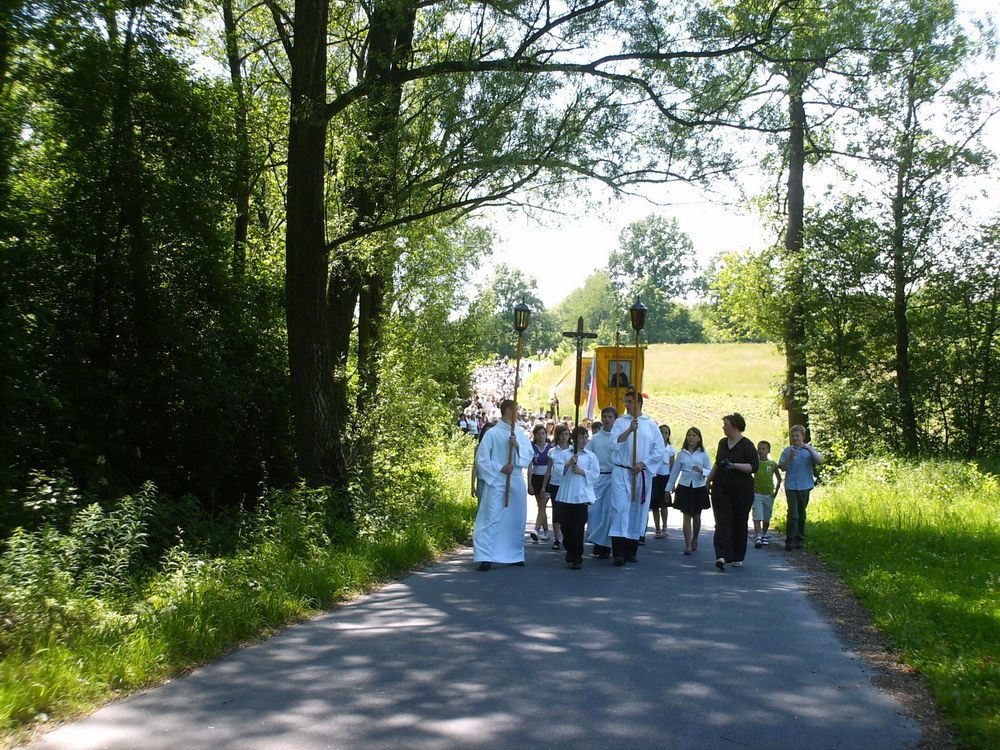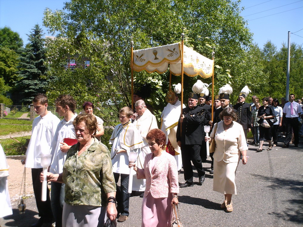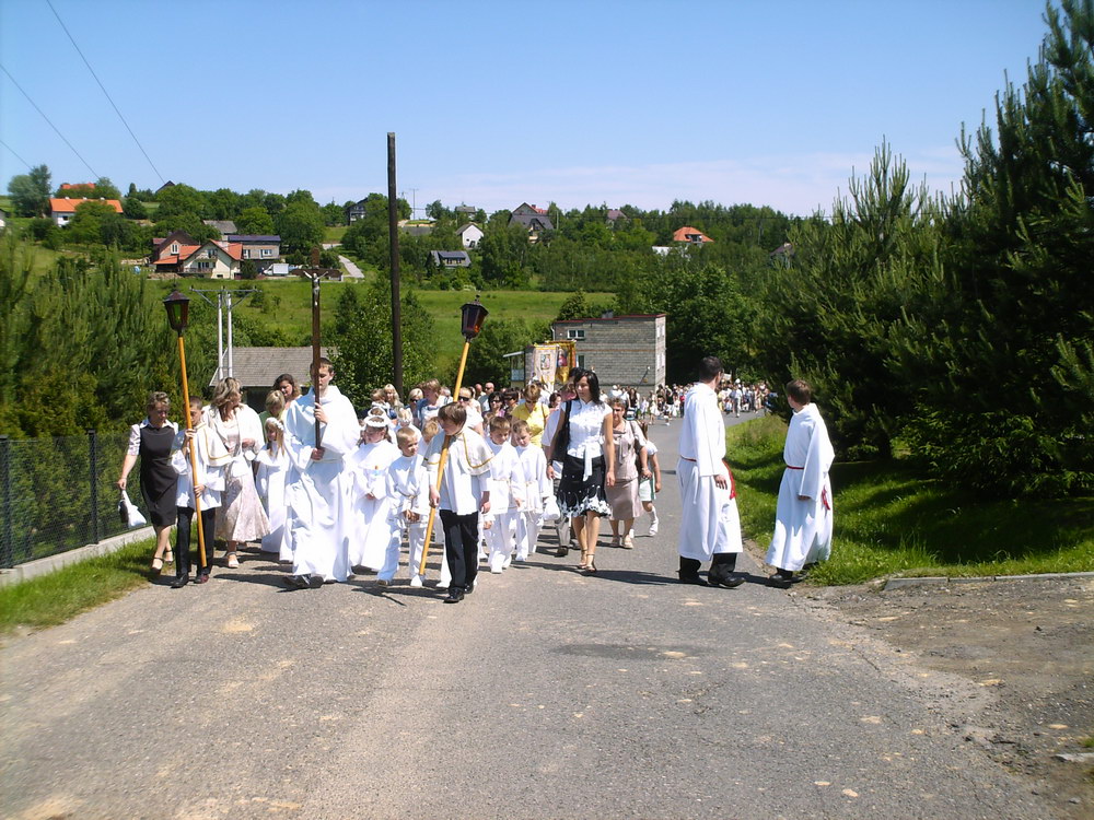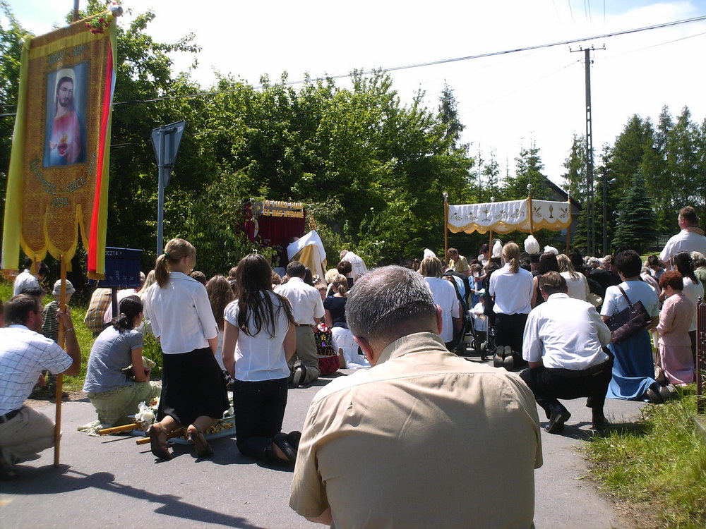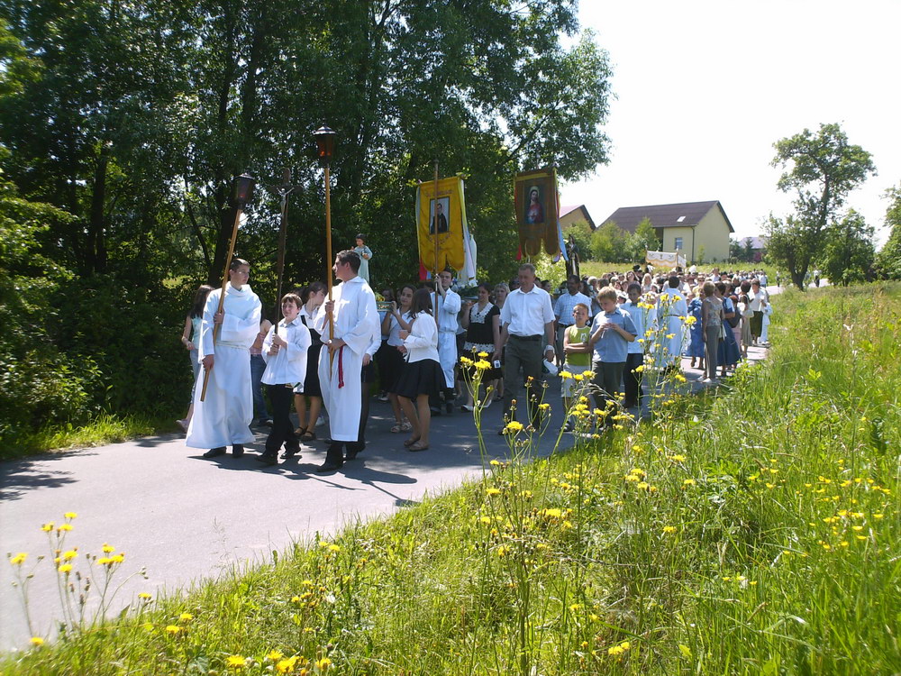 Przy pięknej, słonecznej pogodzie w uroczystej procesji o charakterze dziękczynnym i radosnym, ze swoistą manifestacją wiary i przywiązania do tradycji naszych ojców, z monstrancją z Najświętszym Sakramentem, z feretronami, chorągwiami, dziećmi I- komunijnymi, dziewczynkami sypiącymi kwiatki, chłopcami dzwoniącymi dzwonkami, górnikami, licznie zgromadzeni parafianie i goście przeszli ulicami naszej wioski, by podziękować Chrystusowi za niezwykły dar ustanowienia Eucharystii. Sam Bóg przechodził procesyjnie z nami, pośród naszych pól i zagród, przypominając o tym, że jest z nami zawsze i wszędzie. Trasa tego roku wiodła z kościoła na Bugaj, drogą pod „Wysoką Górą", do skrzyżowania z Janowicami i dalej pod kościół.