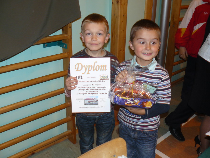 W turnieju chłopców zwyciężył Oliwier Kieliś zdobywając 6 punktów. Najlepszy koźmiczanin Mikołaj Wolanin zdobył 3,5 pkt. zajmując 24 miejsce wśród 50 sklasyfikowanych między innymi z Chrzanowa, Limanowej, Myślenic, Bielska Białej, Olkusza, Jasła, Dębicy, Tych, Nowego Sącza, Ryglic, Sierczy, Staniątek, Skawiny, Chorzowa, Radomia, Pcimia, Przebieczan, Biskupic, Mogilan, Trzebinii, Miechowa, Wieliczki, Krakowa. Znakomicie zagrali reprezentanci Przedszkola w Koźmicach Wielkich, którzy zajęli 3 miejsce drużynowo przegrywając tylko z klubami MKS MOS Wieliczka i UKS przy SP 8 Chrzanów. Sklasyfikowano 33 ośrodki zajmujące się szkoleniem przedszkolaków. Koźmickie przedszkole reprezentowali Jakub Myślak (zdobył 3,5 pkt.), Wojciech Surówka ( 3 pkt.), Jakub Janicki, Kacper Ruśniok obaj zdobywając po 1,5 pkt. Gratulacje dla reprezentantów ich rodziców oraz dyrektor Ewy Kaczor, która z wielkim zaangażowaniem zabiega o rozwój młodych talentów.